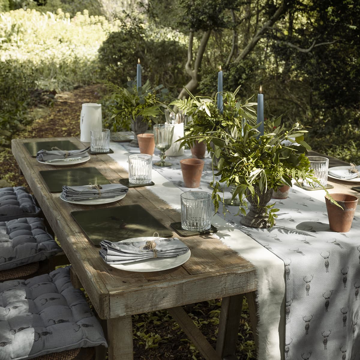 The table runner is covered in magnificent stags on a slate teal coloured background. Perfect to transform your kitchen or dining table. It will add some style to any entertaining. Perhaps consider some matching fabric placemats and napkins to create an impressive table setting to really wow your guests.